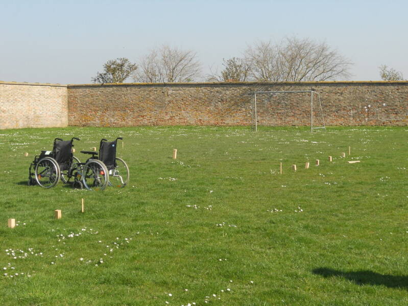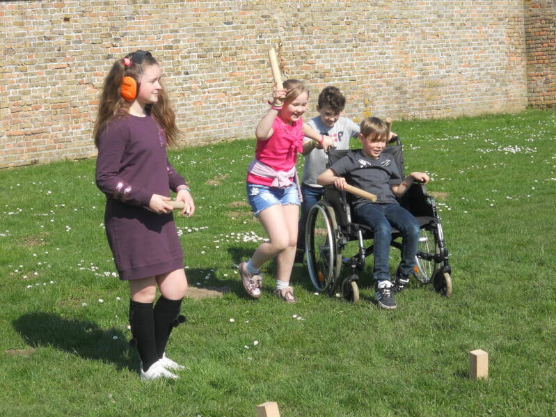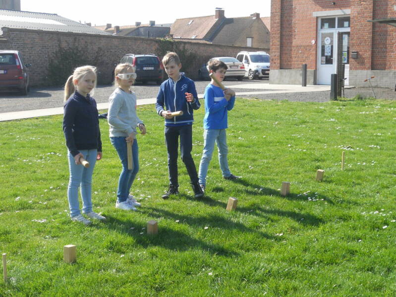 Daarna werd er Kubb gespeeld. De leerlingen speelden in teams per vier. Per team kregen twee leerlingen een kaartje waar een beperking op stond. Om zich in te leven, mochten ze de nodige attributen gebruiken. De andere twee teamgenoten moesten hen helpen. Na 10 minuten werd er gewisseld.